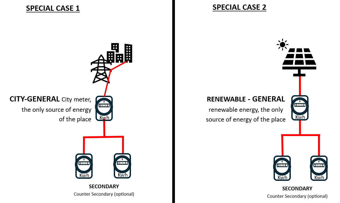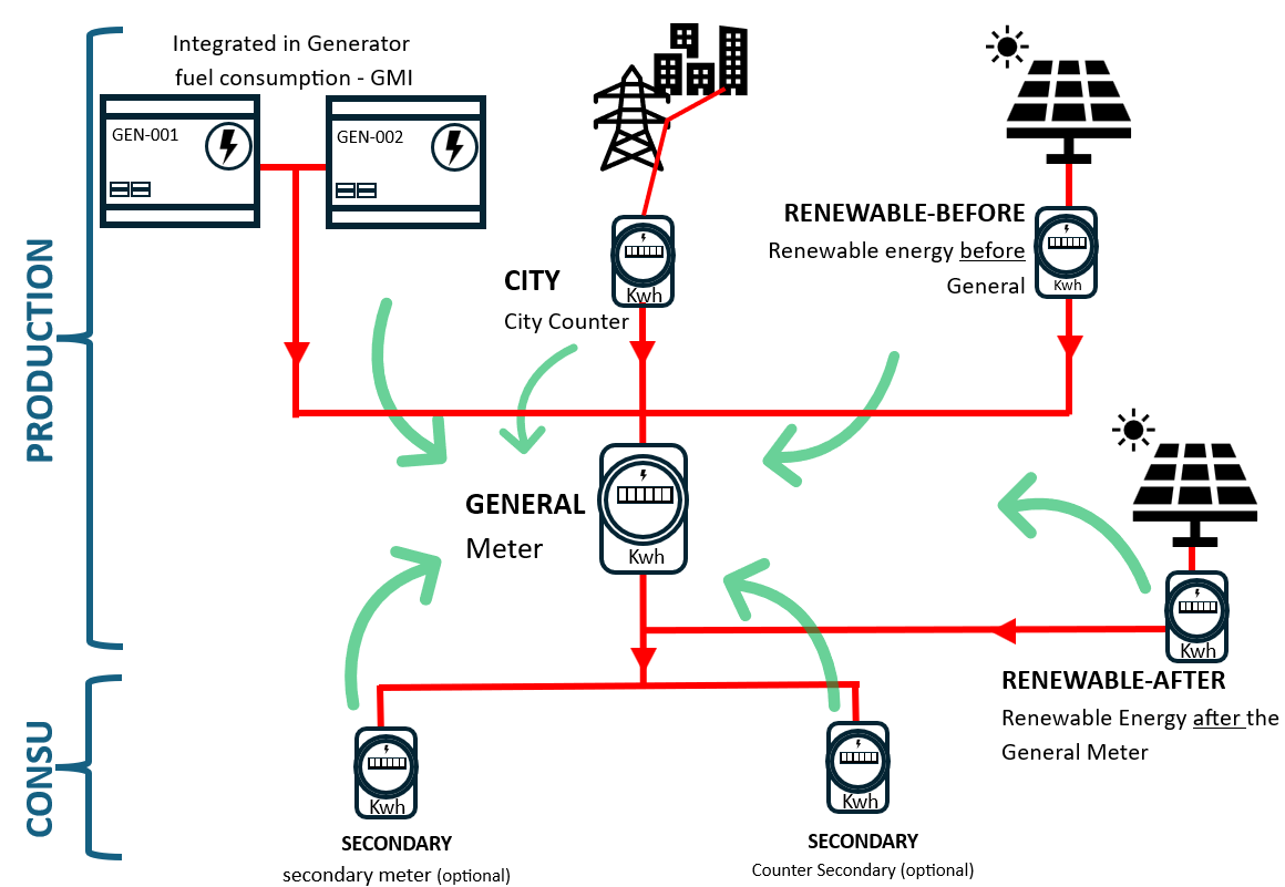 - RENEWABLE-BEFORE: meter associated with a renewable energy production system (solar) positioned before the GENERAL meter