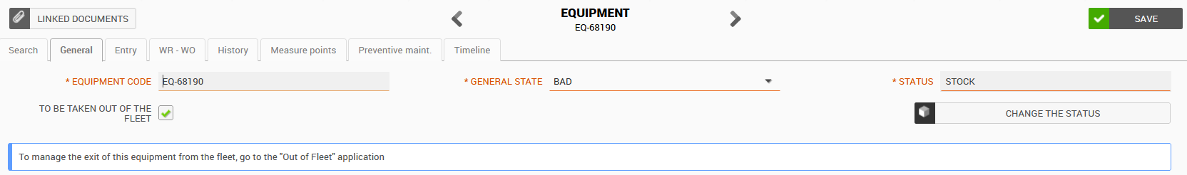 - In the GENERAL DATA module, click on the EQUIPMENT application and open the equipment you wish to decommission.