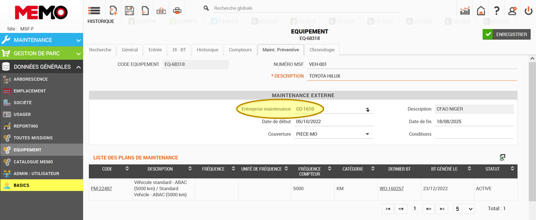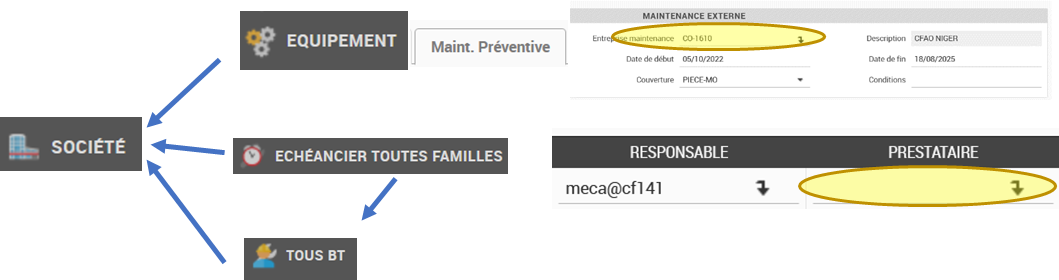 Dans MEMO, les équipements et leur plan de maintenance sont 2 éléments distincte (EQ-XXXX et PM-XXXX). Il faut donc renseigner dans ces 2 éléments le nom de la société en charge de la maintenance préventive de l’équipement. L’information sera générée automatiquement dans les BT.