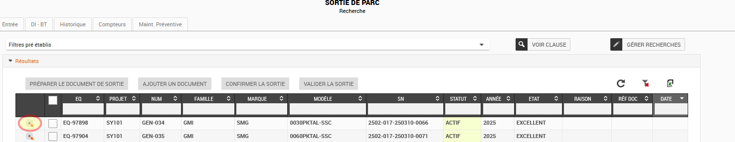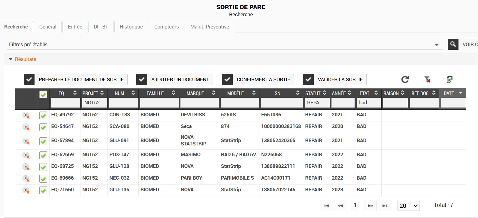 - Pour afficher la liste des équipements à déclasser, cliquez sur GESTION DU PARC, puis sur SORTIE DU PARC
