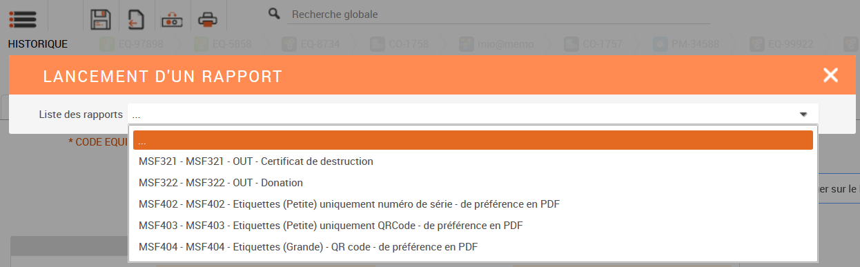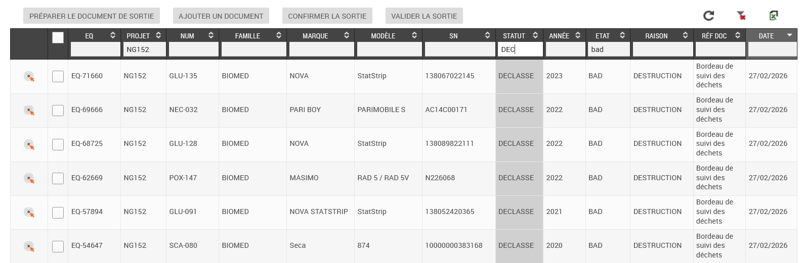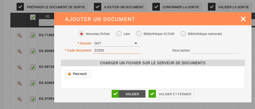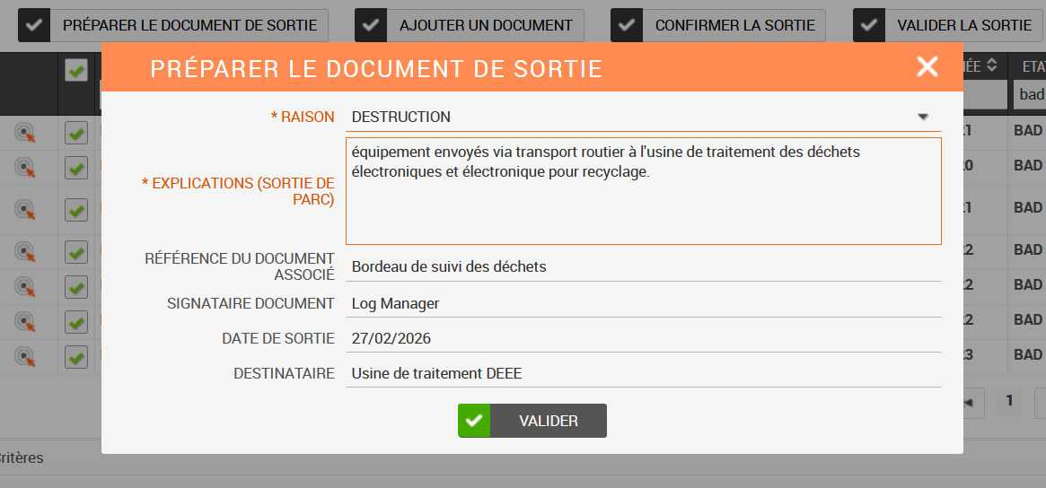 Remarque : Si vous avez dû réouvrir la page depuis l'étape d'avant (préparer le document de sortie), vous devez re-sélectionner les équipements à sortir.