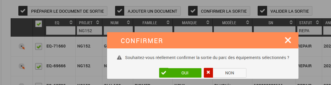 - Sélectionner les équipements que vous souhaitez sortir via la 2ème colonne. Il est possible de sélectionner 1 par 1 ou bien de sélectionner toute la liste via le bouton présent dans l'en tête du tableau.