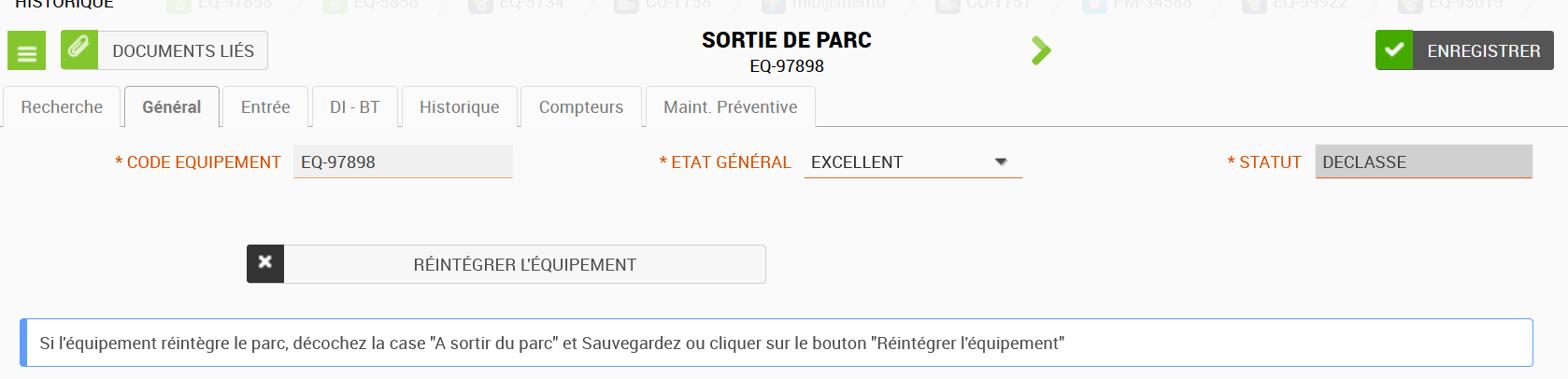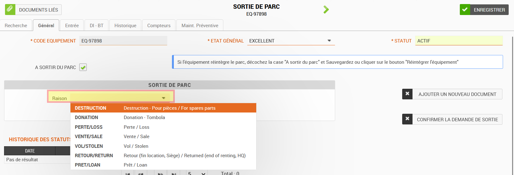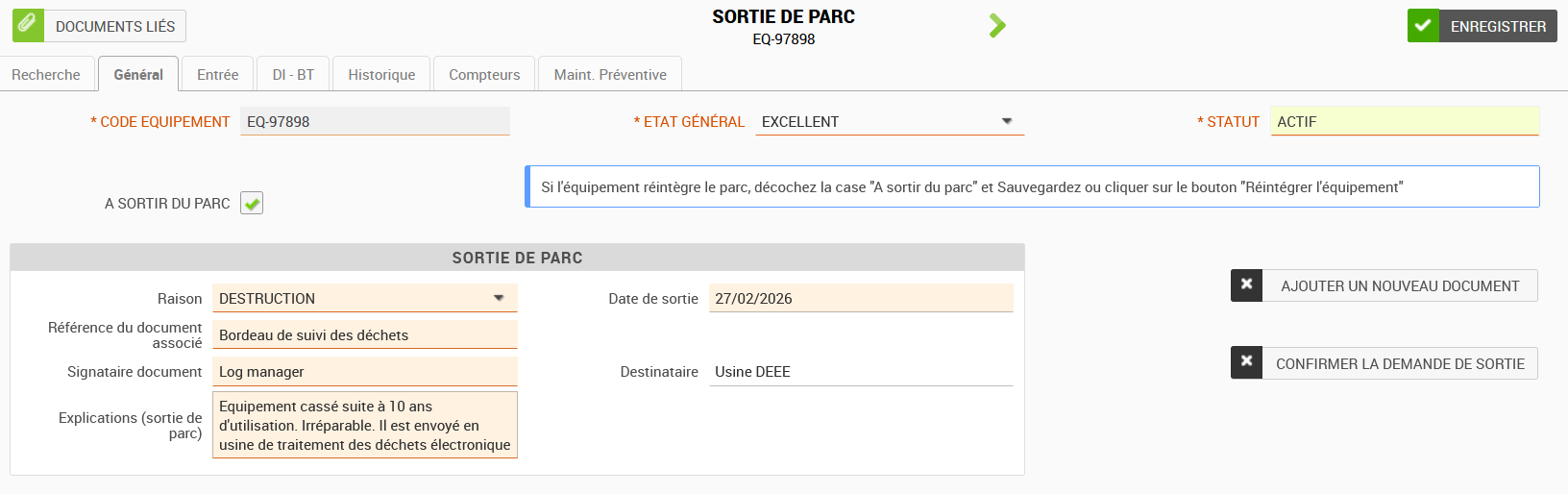 Conseil : vous pouvez compléter uniquement l'explication si l'équipement n'a pas encore été physiquement sortie du parc. Les autres informations seront à compléter avant la validation de la sortie de parc.