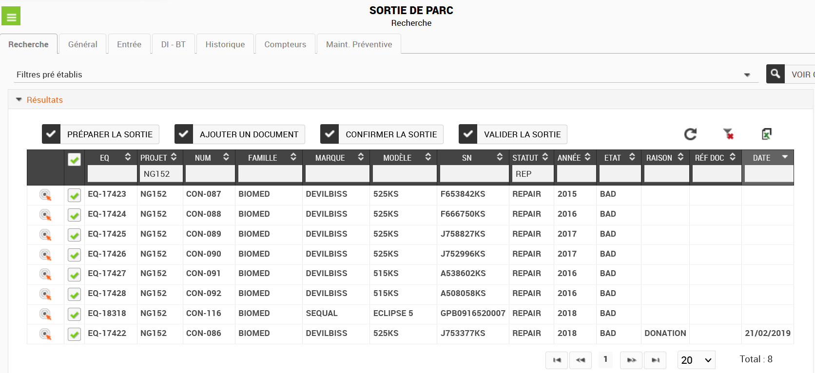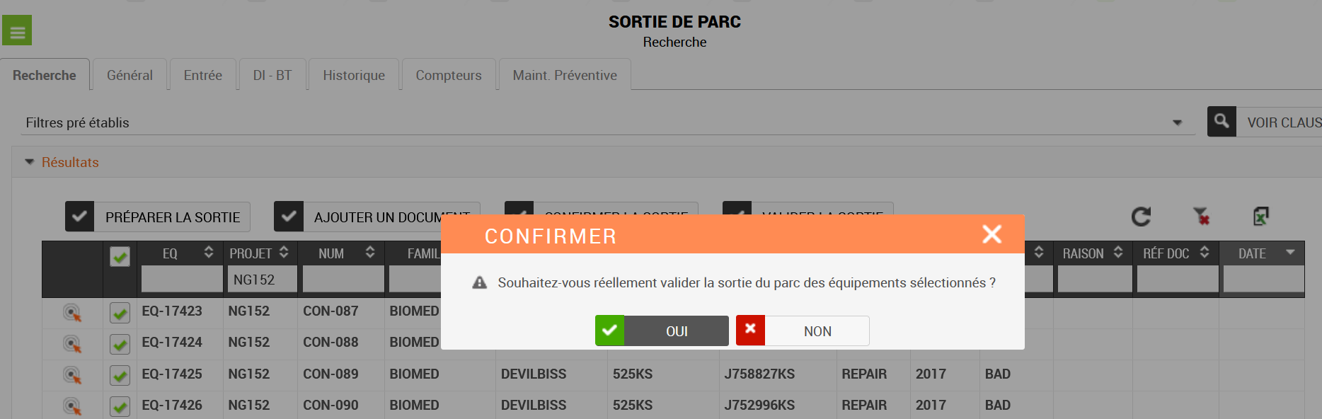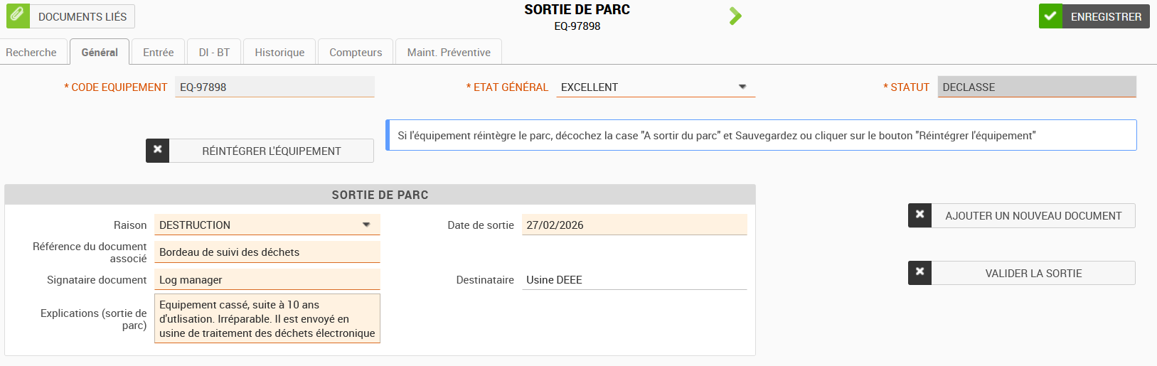 Avant cette étape, il est nécessaire que tous équipements à sortir aient le statut "DECLASSE" et que les informations sur la justification de sortie de parc soit complétée.