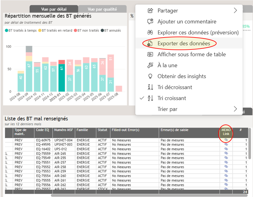 Si vous sélectionnez une valeur dans un visuel en cliquant dessus (exemple ici sur la barre correpondant aux BT du mois de janvier 2025), cela agit comme un filtre dans d'autres éléments visuels, tels qu'un tableau, un diagramme sur la même page.